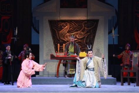 二是台词平实动心。《荐官记》虽然是一部紧扣“廉洁奉公、勤政为民”主题的廉洁教育大戏,但却毫无程序化、机械式的说教。它以少年王密夜读“子曰”为序曲,至剧终童声诵读声再度响起,在两个小时时间内,观众跟随王密,由尚贤、求官、沦丧,到初心在“君子坦荡荡,小人常戚戚。见贤思齐,见不贤而内自省也”中被唤醒,悄然完成了一次优秀传统文化的浸润、洗礼。虽然以东汉安帝年间为背景,但台词都是人人能懂的口语,甚至民间俚语,王密夫人劝慰其自首,“愿一家人吃糠咽菜守清白”的唱腔,王密决心悔过检举樊丰的念白等等,都让观众在同理心中激发共情力,自发报以掌声共鸣!